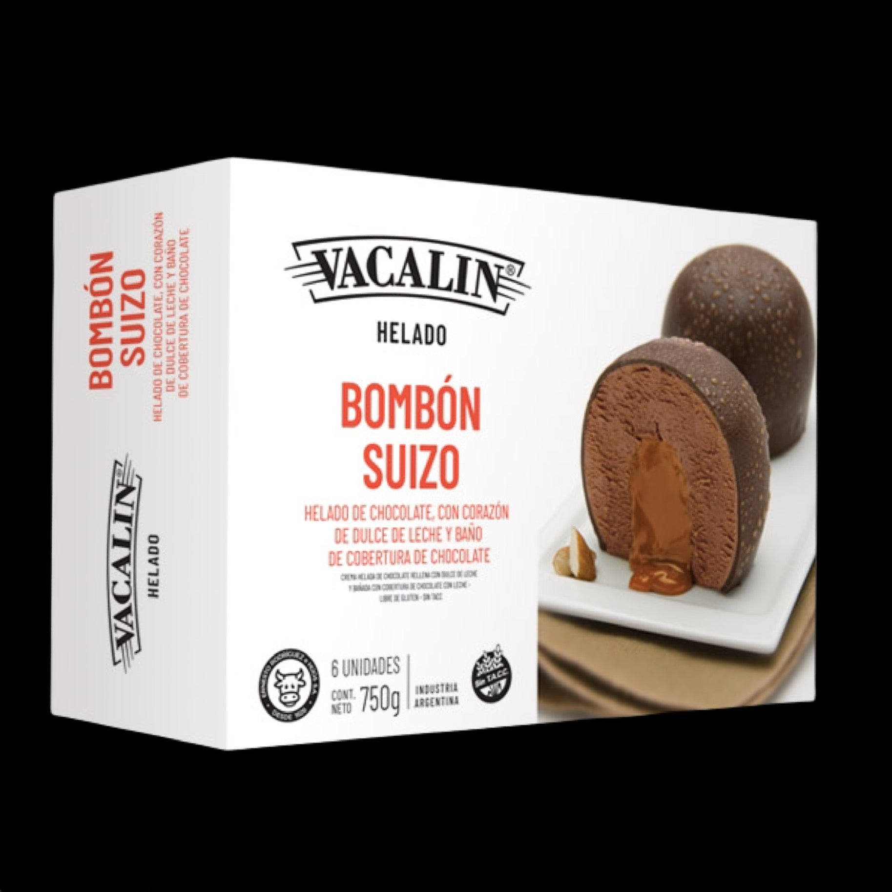 Helado de chocolate, con corazón de dulce de leche y baño de cobertura de chocolate.