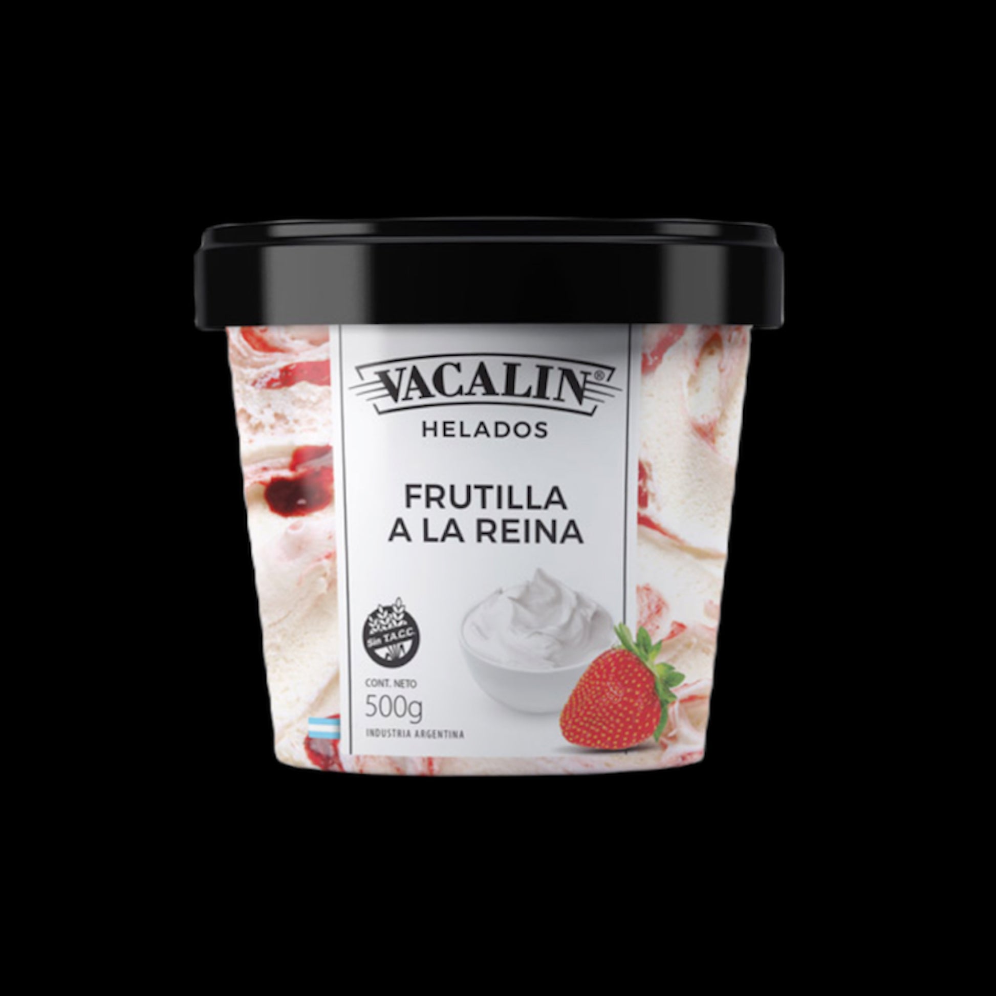 Crema helada de Frutilla a la reina con fruta entera y salsa de frutillas.